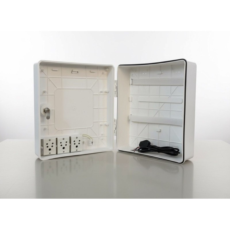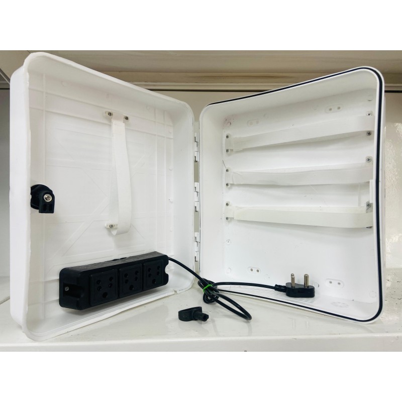 - PVC waterproof enclosure with grip and lock. Comes three power sockets with an inbuilt protective fuse for easy connectivity.
